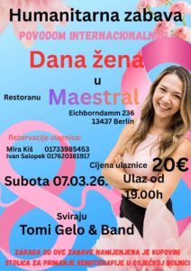 Berlin/ U restoranu Maestral, na adresi Eichorndamm 236, 13437 bit će u subotu 7.03.2026. godine, humanitarna zabava povodom Međunarodnog dana žena.