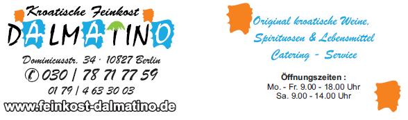 Berlin/Trgovina hrvatskim proizvodima “Dalmatino” je na adresi Dominicusstr. 34, 10827 Berlin, S Bahn 1 Schöneberg. Radno vrijeme trgovine je od 9,00 do 18,00 sati a subotom od 9,00 do 14,00 sati. U vrijeme ljetnih odmora, od 18. lipnja do 04. kolovoza, radno vrijeme “Dalmatina” bit će nešto skraćeno, svaki dan (osim nedjelje) od 09,00 do 15,00 sati.