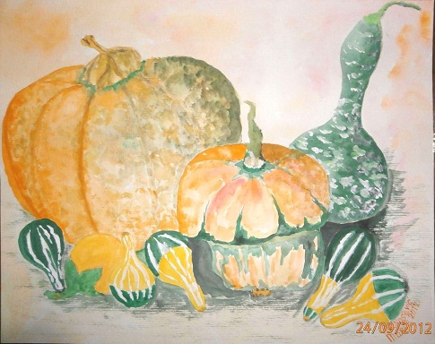 Stružec/Kako već dugo nisam intezivno crtala! Nisam niti imala namjeru početi, jer me drugi poslovi potpuno zaokupljaju. Ipak su me susjede “natjerale”. Nenamjerno! Naime, donijele su mi puno prelijepih tikvica iz svog vrta, svih oblika i boja. Jesenskih boja. I ja počela …i onda nema više kraja. Posloži ih ovako, pa onako … Ne znaš kako su ljepše! Odlučih se za kombinaciju tempera-akvarel. Slike nastaju noć i dan …Kad susjede dođu u radionicu …čude se.
