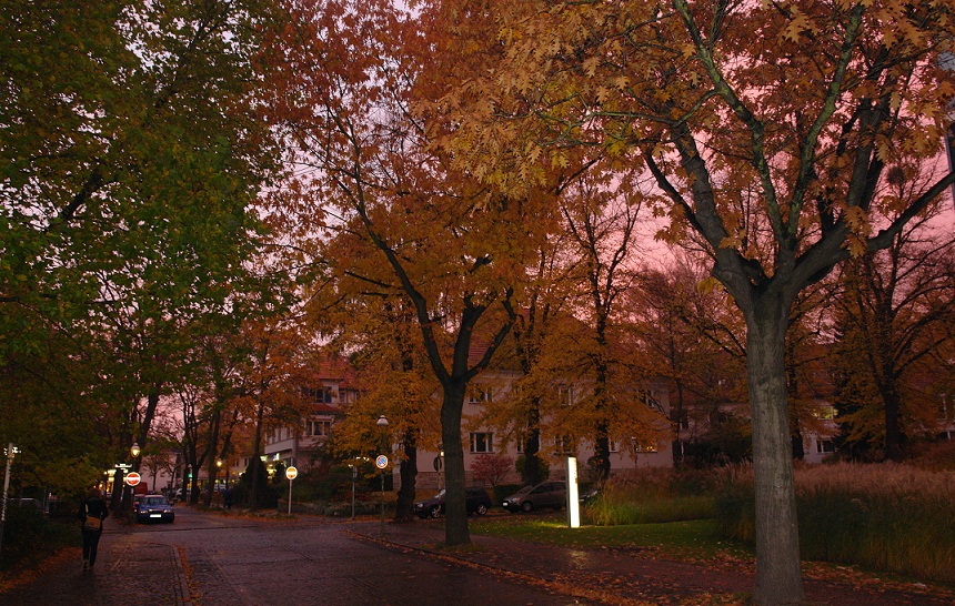 Berlin/ Prava jesen. Hladan dan je zamijenila maglovita i hladna večer. Za jutro najavljuju temperature ispod ništice. Prošetah danas nogom i kamerom po Dahlemu, periferija grada. Pravi vatromet jesenjih boja, lišće šušti pod nogama. Večer je. Njemačka metropola utonula u maglu. Obavijen bijelim ogrtačem, kao haljinom za snove …padaju mi u ovom trenutku na pamet stihovi našeg suradnika, pokojnog Milorada Cifreka …grad se sprema na počinak. Sutra je novi, jesenji dan …