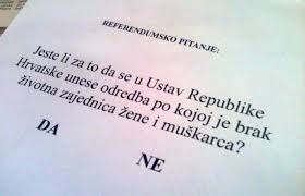 Referendum u Hrvatskoj bio i prošao. Referendumsko pitanje je glasilo: Jeste li za to da se u Ustav RH unese odredba po kojoj je brak životna zajednica žene i muškarca?