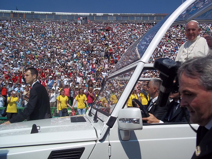 Svi su okretali glave u smjeru kojim je trebao proći papamobil. A u njemu je papa stojeći, smješeći se i s ispruženim rukama blagoslivljao okupljeni narod.…