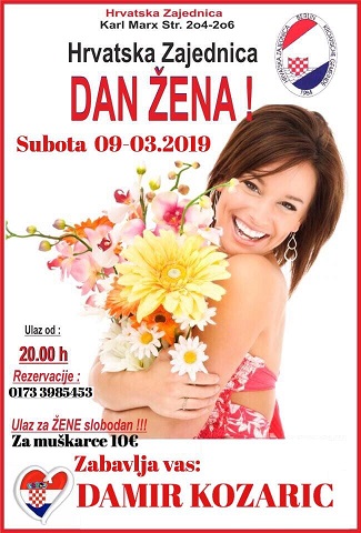 Berlin/ Hrvatska kulturno-umjetnička i sportska zajednica Berlin organizira proslavu Dana žena u subotu, 09.03.2019. godine u 20 sati.