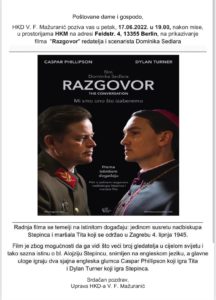Berlin/ Hrvatsko kulturno društvo Vladimir Fran Mažuranić organizira i poziva na prikazivanje filma “Razgovor” redatelj i scenariste Dominika Sedlara u petak, 17.06.2022.u 19 sati u prostorijama Hrvatske katoličke misije Berlin, na adresi: Feldstr. 4, 13355 Berlin.