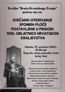 U povodu obilježavanja 1100. obljetnice Hrvatskoga Kraljevstva, u subotu, 27. prosinca 2025., u primorskom mjestu Sveti Juraj kraj Senja održat će se svečano otkrivanje spomen-ploče posvećene ovom iznimno važnom jubileju hrvatske povijesti i državnosti. Svečani program započinje u 10.30 sati svetom misom u Župi Svetoga Jurja Mučenika u Svetom Jurju.…