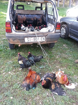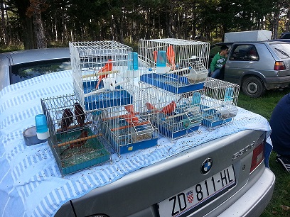 Dekom prekrivena auta s krletkama kanarinaca na njima, perad vezana najlonom za jednu nožicu da ne odkukuriče među grmlje, kunići u kavezu …