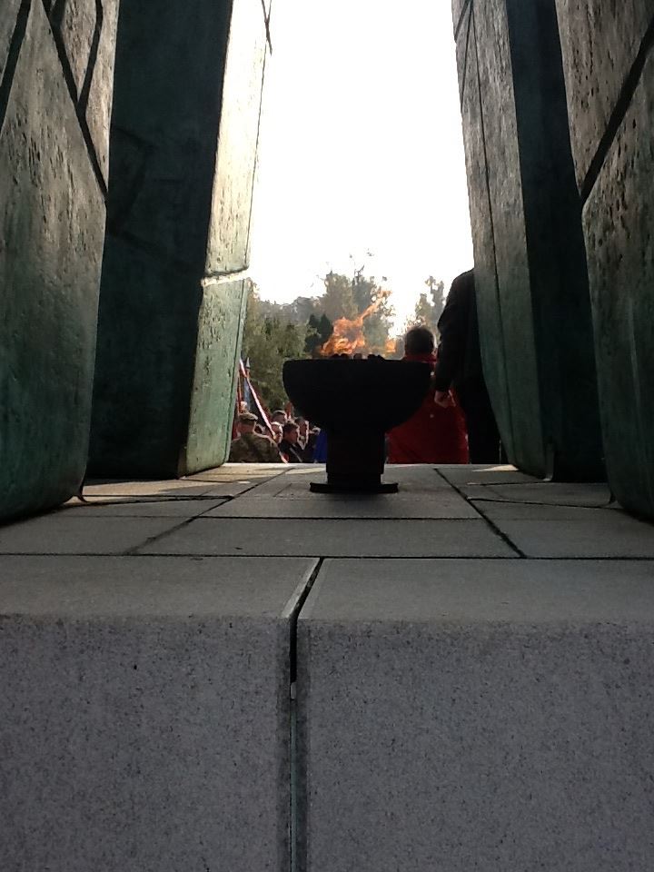 Auf einer Bühne findet ein Gottesdienst statt. Ich entscheide mich zur Kranzniederlegung zu gehen. Minister, Präsidenten usw. alle sind da.