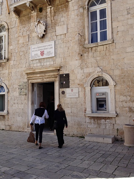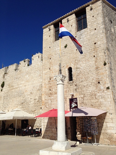 Dok pijuckam kavicu divim se pogledu, iznad mene zvonik katedrale, lijevo gradska loža iz 14. stoljeća sa kamenim spomenikom slavnom trogirskom sinu hrvatskom biskupu i banu Petru Berislaviću koji je poginuo u bitki protiv Turaka, ali i pobijedio.