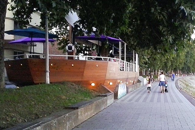 Ovo je jedan takav primjer. U Slavonskom Brodu dopuštena je izgradnja ovog ugostiteljskog objekta na kruni nasipa. Objekt je zatvorio pristup jednom stubištu koje vodi na šetnicu. Razina gornje stube je ispod razine krune nasipa što kod slobodnog pristupa nije problem, jer se može lako zatvoriti drvenim gredama.