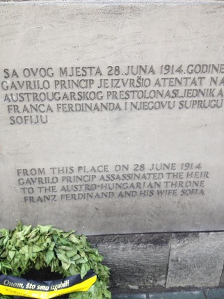 Na mjestu gdje je Princip stajao i gdje su prije bile stope u betonu, sada je natpis ( i na engleskom jeziku): „Sa ovog mjesta 28. juna 1914. godine Gavrilo Princip je izvršio atentat na austrougarskog prestolonasljednika Franca Ferdinanda i njegovu suprugu Sofiju.“