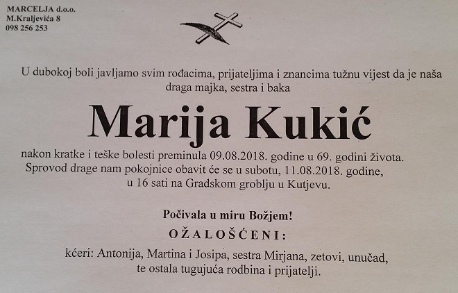 Požega/ Nakon kratke i teške bolesti, 09.08.2018. u 69. godini života, preminula je Marija Kukić.