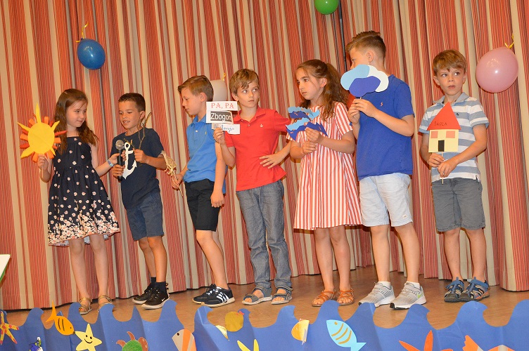 -Došli smo do trenutka kada vam želimo reći da se priopremite za let u daleki dječji svijet. Ugodno se smjestite, pripremite osmijeh i dlanove jer pred vas dolaze učenici koji će vam reći da njihova mašta može svašta, rekao je voditelj Mate Vukadin. A onda su se nizale točka za točkom. Pjevali su, plesali, recitirali: Leona, Maja i Lucija, Marta, Toni, Ivano, Niko, Mila, Ivano i Nikola, Anna Maria, Leon Josip, Stipe i Ivano Duje, Ana, Laura i Ana, zatim: Noa, Robert, Luka, Rebeka, Eva, Mijo i Mateo, Marijela i Ante, Lana, Karmela i Ante, Barbara, Gabrijela i David, Luka i Ivan, Fabian, Marta i Ilijana, Lena i Lana, Mia i Maja, Nikola, Luise, Julia i Luis, Doris, Andrea i Paula i na koncu Dea, Dino i Nathalie koji su zapjevali poznate pjesme “Kad bi svoi ljudi na svijetu” i na kraju i “Vjeruj u ljubav”.