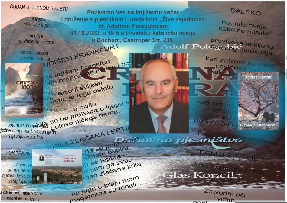 Naime, Matica hrvatska za Ruhrsko područje poziva na književnu večer i druženje s pjesnikom i urednikom “Žive zajednice” dr. Adolfom Polegubićem.