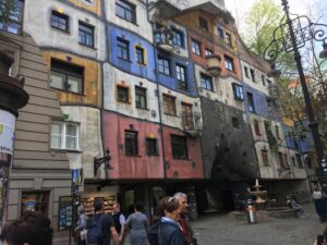 U šetnji ulicama Beča, šetnji kroz povijest nastanka i mijenjanja ovog jedinstvenog gada nezaobilazna postaja je i neobična Hundertwasser-Haus, sagrađena u 20. stoljeću. Svojom raznobojnom i neravnom fasadom privlači poglede. Doznajem od vodiča kako svaki stanar ima pravo dizajnirati fasadu oko svoga prozora onako kako želi. Čovjek treba živjeti u simbiozi s prirodom poruka je arhitekta, a oko 200 stabala i grmova na balkonima i terasama ove jedinstvene kuće pokazuju i kako to ostvariti. Ulazim i u mali trgovački centar dizajniran od istog umjetnika nastao iz nekadašnje radionice guma. Unutra su male trgovine sa prigodnim suvenirima i dosta zelenih biljaka, prava mala oaza u užurbanom gradu.
