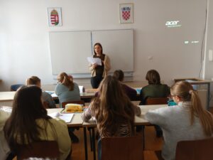 Nakon temeljitih priprema u Zagrebu, studentice Dora Palčić i Sara Sivić te student Filip Gabrić držali su nastavu iz hrvatskoga jezika i književnosti u 5. i 7. razredu osnovne škole. Nastavne jedinice izabrane su u dogovoru s predmetnim nastavnicama u pečuškoj školi. Sve troje studenata uspostavilo je dobru komunikaciju s učenicima i uspješno završilo praktični dio svojih obveza na predmetu. Zajedno s profesoricom Vulić njihovu je nastavničku praksu pratila asistentica Lidija Bogović.