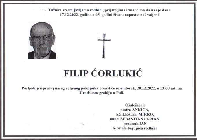 Posljednji ispraćaj našeg dragog dida Filipa bit će danas, 20.12. u 13 sati na Gradskom groblju u Puli.