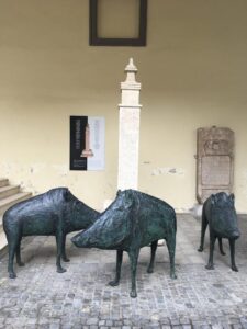 Još je jedan spomenik, ali unutar zidina Starog grada koji podsjeća na Nikolu Zrinskog Čakovečkog. Posjetitelje Starog grada privlači neobičan postav. Suprug i ja idemo bliže pogledati. Tu su tri tamne figure vepra u prirodnim veličinama i bijeli vitki obelisk sa urezanim riječima. Podsjetnik je to na kobni lov u kojem je od ranjenog vepra tragično stradao ban Nikola. Od vepra je stradao hrvatski ban zapisana je službena verzija, a neslužbena koja se odmah pojavila među narodom bila je da je ubijen od plaćenika bečkog dvora.