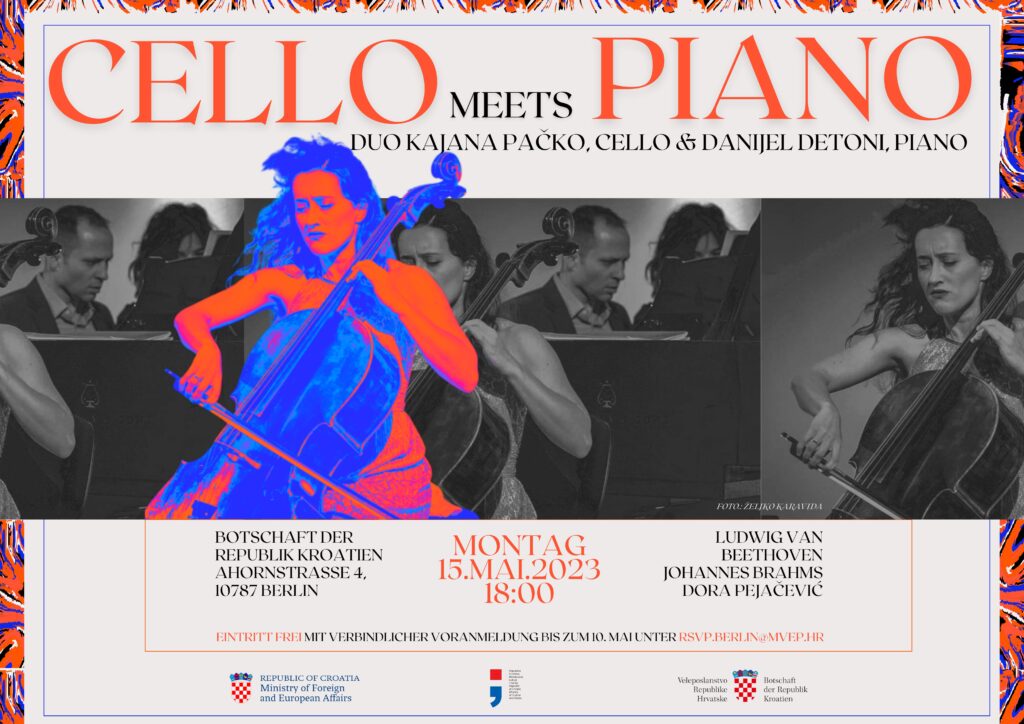 mit der Cellistin Kajana Pačko und dem Pianisten Danijel Detoni am Montag, 15. Mai 2023, um 18:00 Uhr in die Botschaft der Republik Kroatien (Ahornstraße 4, 10787 Berlin) ein.