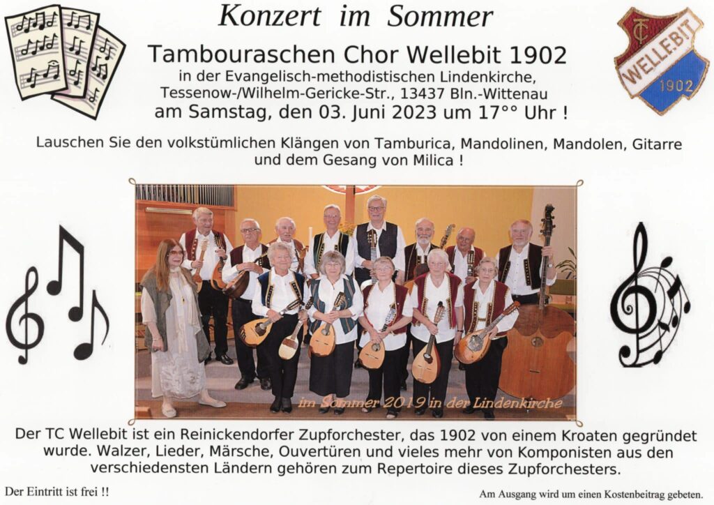 Ljetni koncert Tamburaškog orkestra Wellebit 1902 je u subotu, 03. lipnja u evangeličko-metodističkoj Lindenkirche.