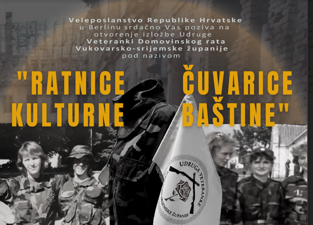 Berlin/ Veleposlanstvo Republike Hrvatske u Berlinu organizira i poziva na otvorenje izložbe pod nazivom “RATNICE ČUVARICE KULTURNE BAŠTINE”, u petak 17.11.2023. u 18 sati, povodom obilježavanja Dana sjećanja na žrtve Domovinskog rata i Dana sjećanja na žrtvu Vukovara i Škabrnje.