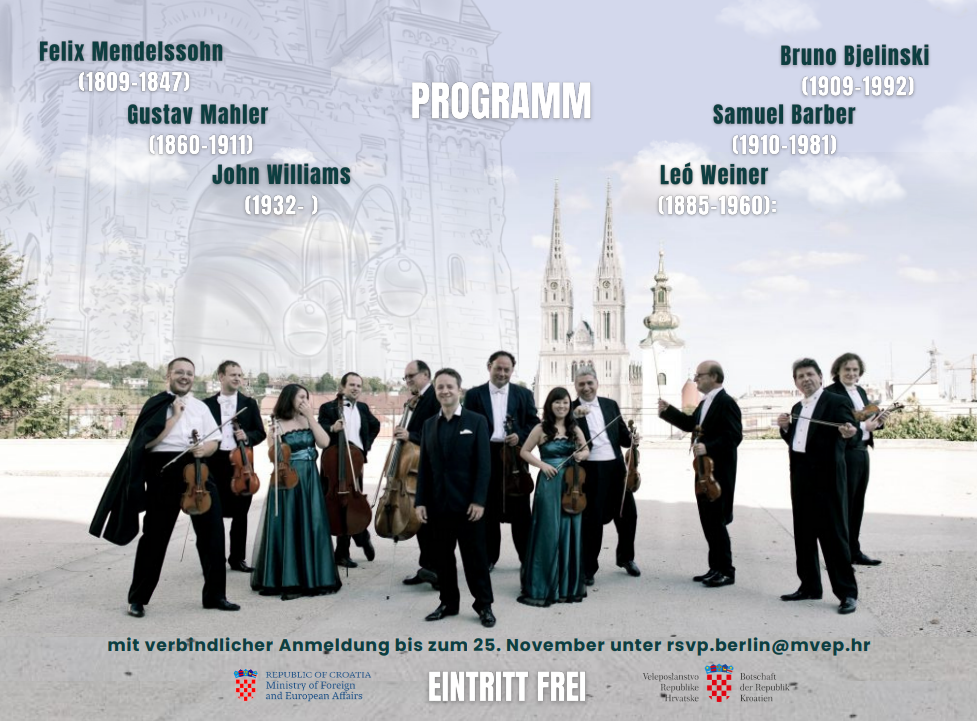 Berlin/ U povodu hrvatskog predsjedanja Međunarodnim savezom za sjećanje na holokaust (IHRA), Veleposlanstvo Republike Hrvatske organizira i poziva na koncert gudačkog ansambla Zagrebački solisti.