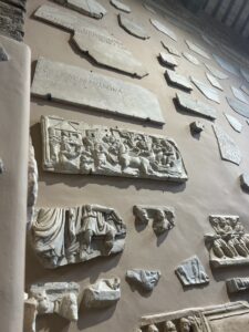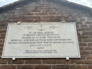 U kapeli prije ulaza u katakombe gledam bistu De Rossija, nije prikazan kao mladić nego dostojanstveni stariji gospodin. Na zidovima kapele su ulomci s grobnica kršćana, simboli ribe, golubice, vinove loze, sidra, dijelovi natpisa – svjedočanstva vjere kršćana.