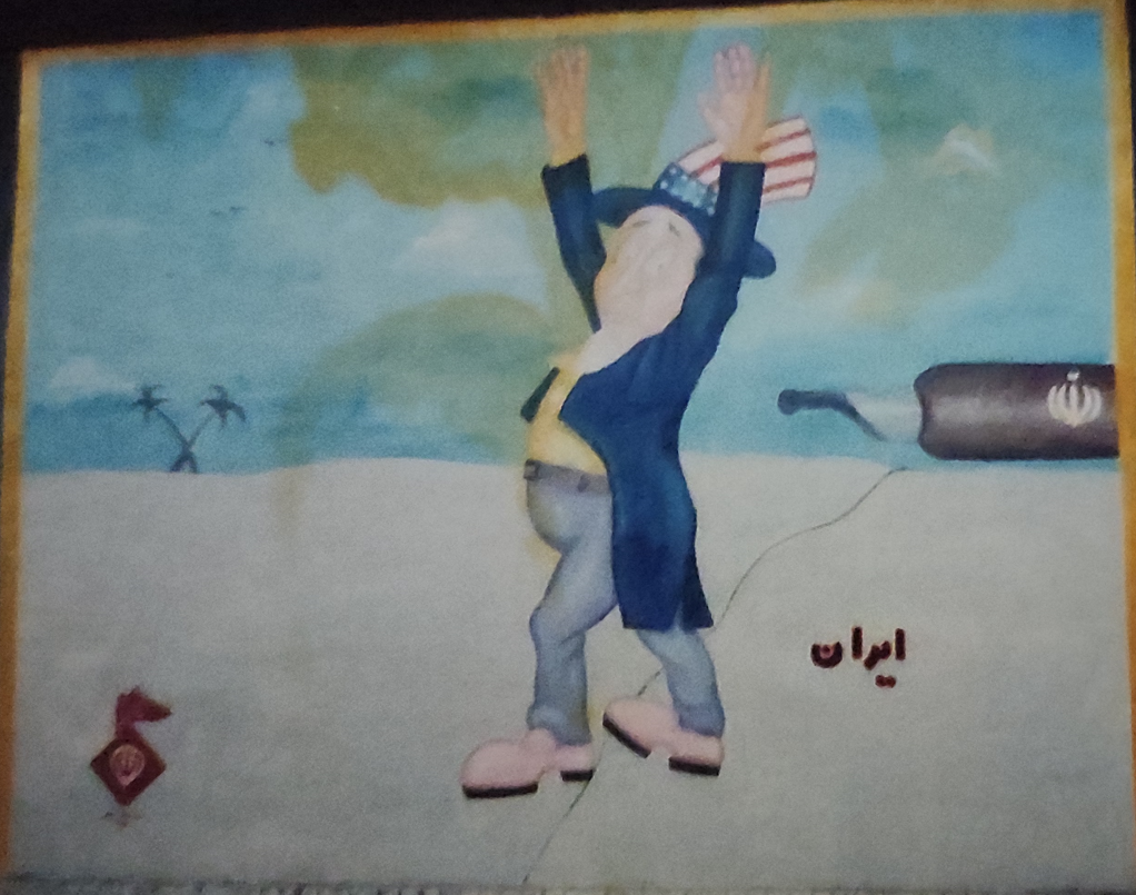 Ujak Sam, personifikacija Sjedinjenih američkih država, negdje u perzijskoj pustinji, s uzdignutim rukama u znak predaje, izgleda jako uplašen, iako je iza njega samo obično pero, nalivpera na kojem je simbol nove Islamske republike Iran.