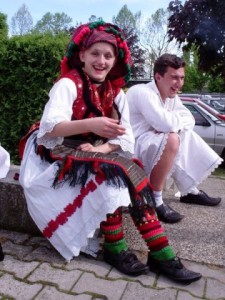 Ispratila nas snaša Marija na drum (cestu). Prid kućom guske no malo suve trave pasu, glave u jedni crvenom, u drugi plavom farbom zafarbate.