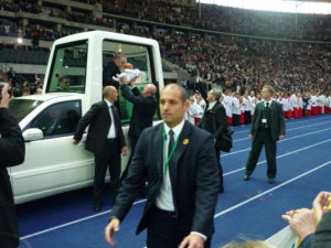 S druge strane stadiona, u odjeljku P, točno preko puta novinarskih tribina, velika skupina Hrvata. Hrvatska katolička misija podijelila je oko 1800 besplatnih ulaznica. No na ovom događaju Hrvati …kao ni ja sama …nisu samo vjernici i promatrači kao prije 15 godina. Već i sudionici. Dogodile se promjene. Na stadionu nastupio, predivno pjevao… Zbor mladih Hrvatske katoličke misije. Zborom s puno žara ravna naša Suzana. Naše djevojke, Marija, Ana i Matea, govorile o tome kako žive mladi stranci, katolici u Berlinu, kako žive Hrvati.