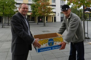 Prije svega ne želimo propustiti napraviti sliku susreta. Drago i Emil ponovo u akciji. Na slici od prije pola stoljeća zajednički smo nosili kamen, ali sada se zadovoljavamo praznom kutijom od banana. Ne treba pretjerivati. Slika nas antikvar knjiga koji ima štand na korzu.