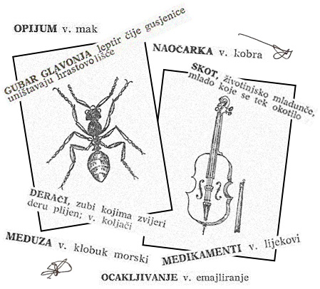 Kada se govori o brojkama, možemo reći kako je leksikon bio pravi mali internet onoga doba s više od 10.000 pojmova, a najveća fora su crteži koji su pored svakog pojma crtani ručno i s puno detalja. Njihovi autori su Dubravko Budić i Mirko Šalamon, najveće face grafičkog dizajna onoga vremena. Tko zna koliko im je vremena trebalo kako bi napunili cijeli leksikon svojim crtežima. Oprezno listajući ovu beskrajnu vintage knjižicu, izvukli smo nekoliko zanimljivih i smješnih pojmova. Idemo vidjeti što se to učilo u školama za vrijeme pionira, nestašice goriva, otkrivanja jeansa, trapezica i ludih disko čaganja.
