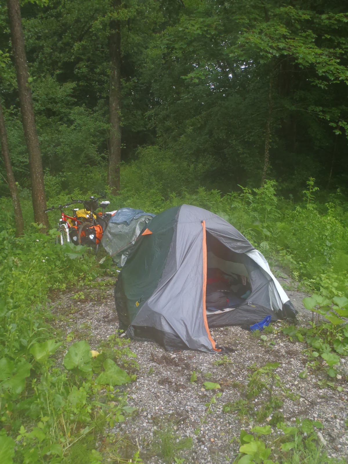 Iza podneva ipak krećemo, sunce nas prati. Do granice. Ulazak u Sloveniju počinje sa kišom. A ona krene pa stane pa pljušti pa stane. Ipak taj dan nismo dogurale do Celja. Stale smo kod Podčetrtka jer kiši nije bilo kraja. Dizanje šatora i guranje u njemu sa mokrim i prljavim i smrdljivim Onnijem 🙂 A nismo ni mi bile bolje!