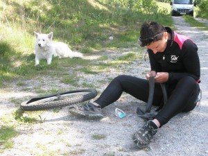 Stajemo sa strane, skidanje kotača, provjera, nema više cijelih zračnica, krpanje. Fail. Krpamo, pumpamo, ok je. Stavimo kotač na bic, ispusti. Sjedimo uz cestu, umorne i nemoćne. A ništa, dizanje šatora i čekanje jutra. Jutro je pametnije, a mi smo odmornije. Ionako je skoro kraj dana.